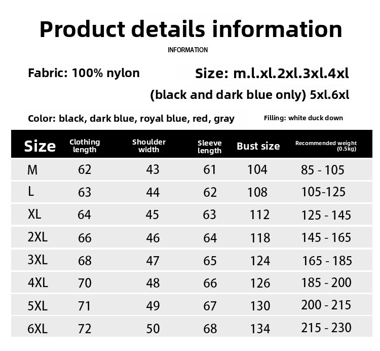 Matière : Extérieur et doublure en nylon, garnissage en duvet de canard blanc