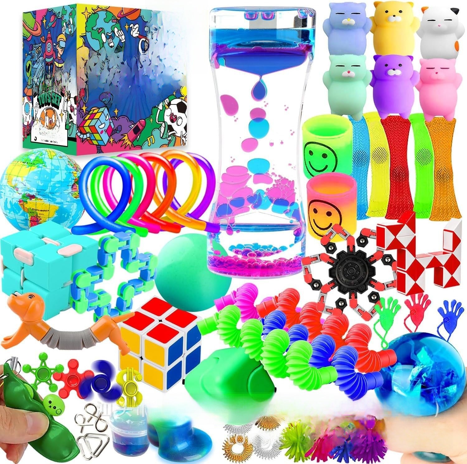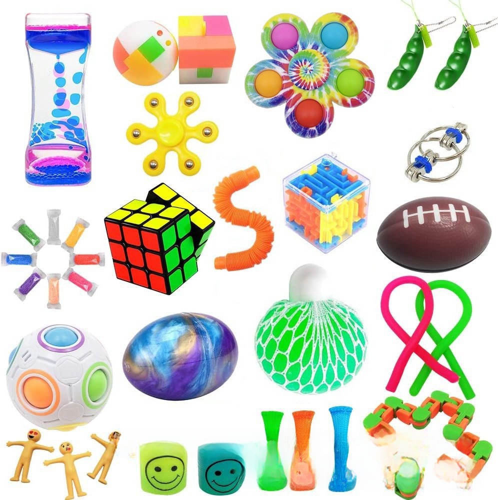 Options de jeu multiples : comprend 24 maillons de chaîne, de la pâte à modeler à presser, un Rubik's Cube, des billes de raisin et bien plus encore pour des expériences tactiles variées.