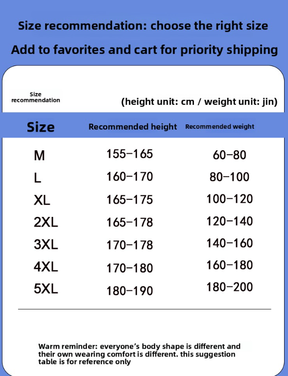 Sizes: M, L, XL, 2XL, 3XL, 4XL, 5XL