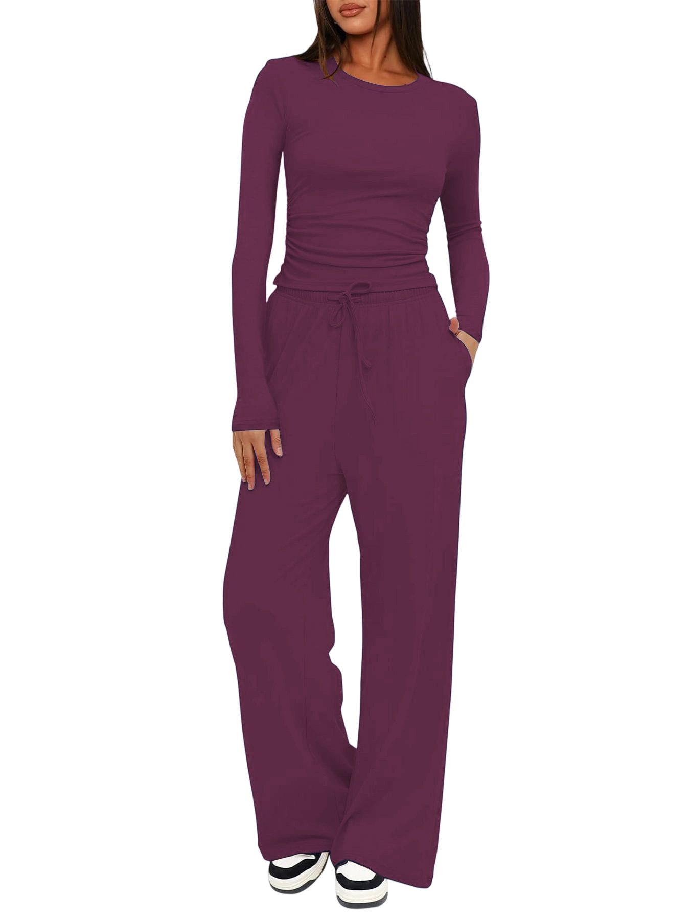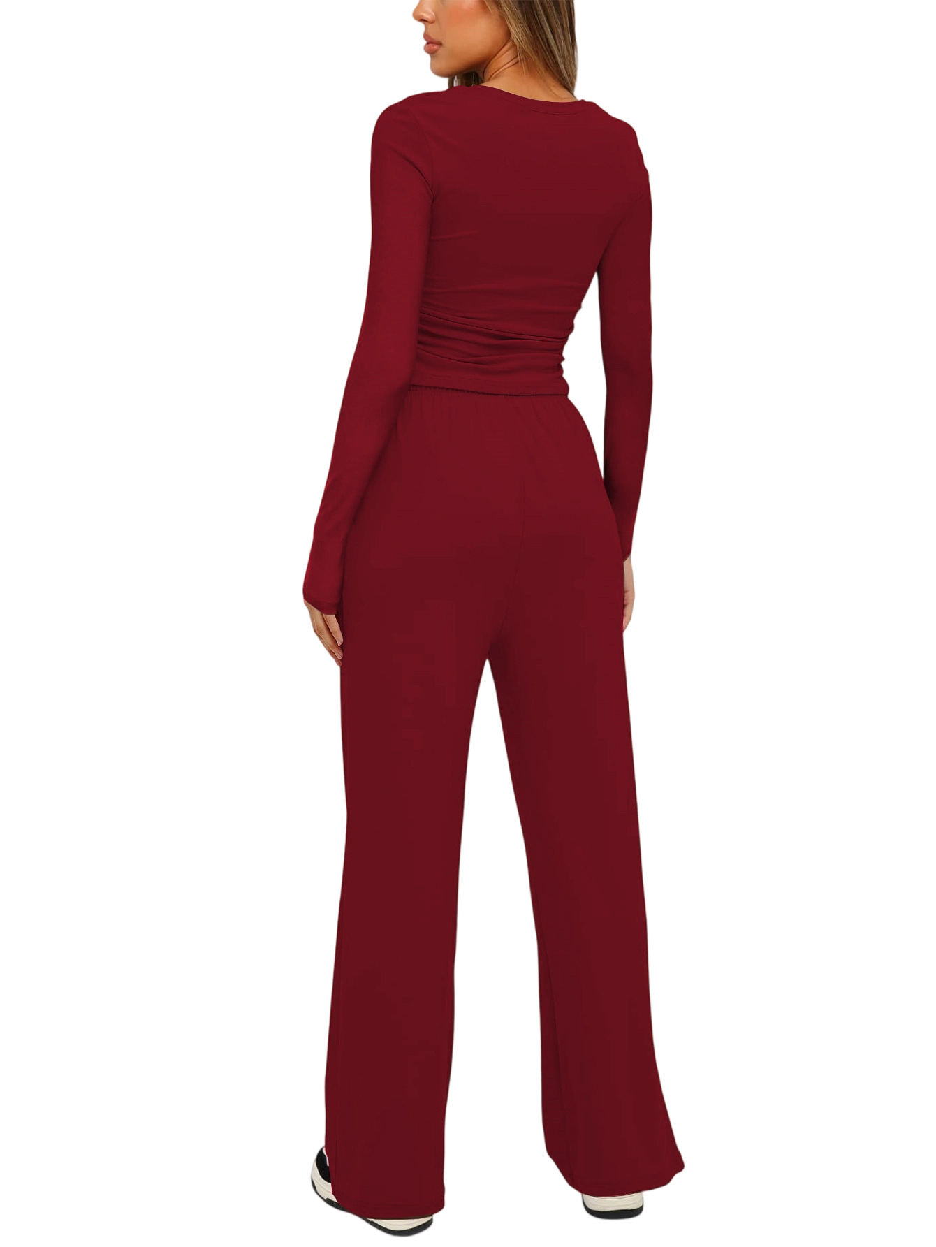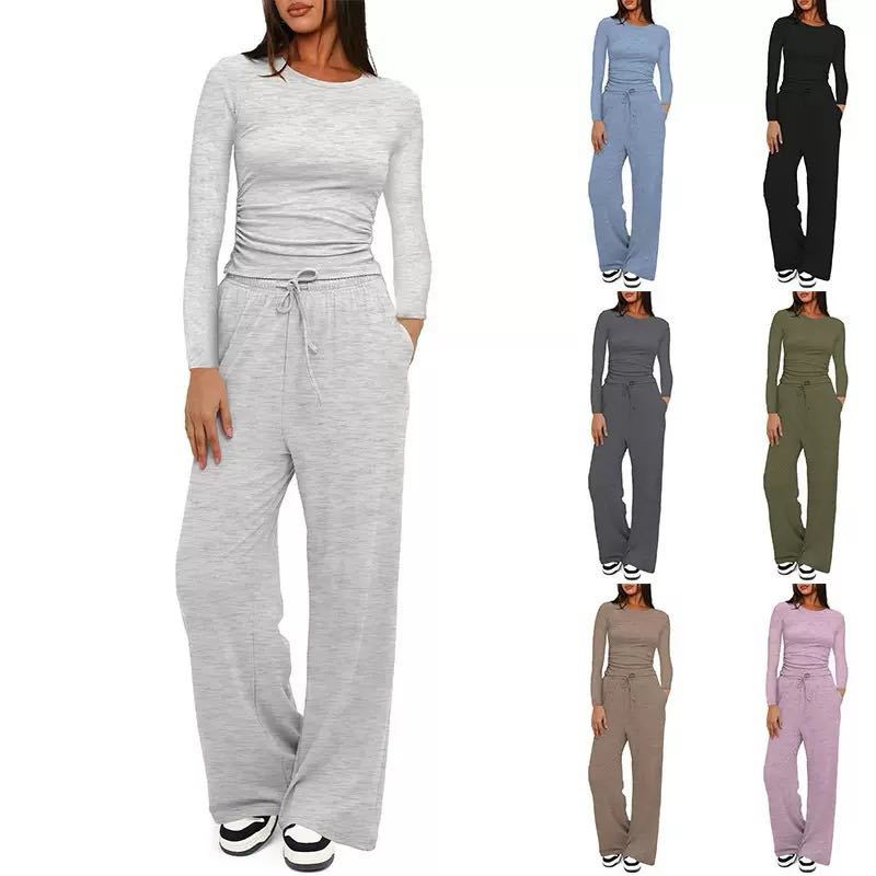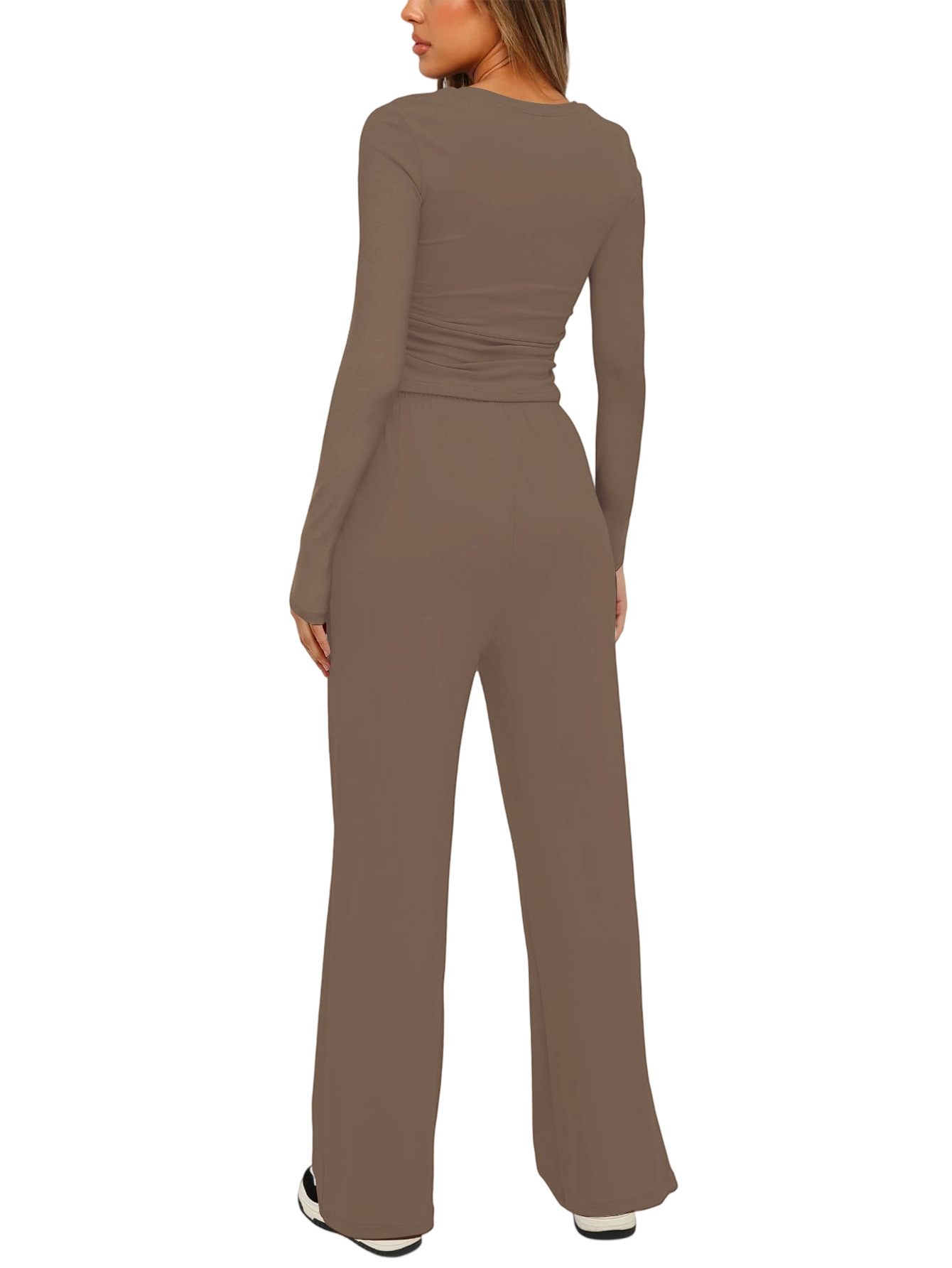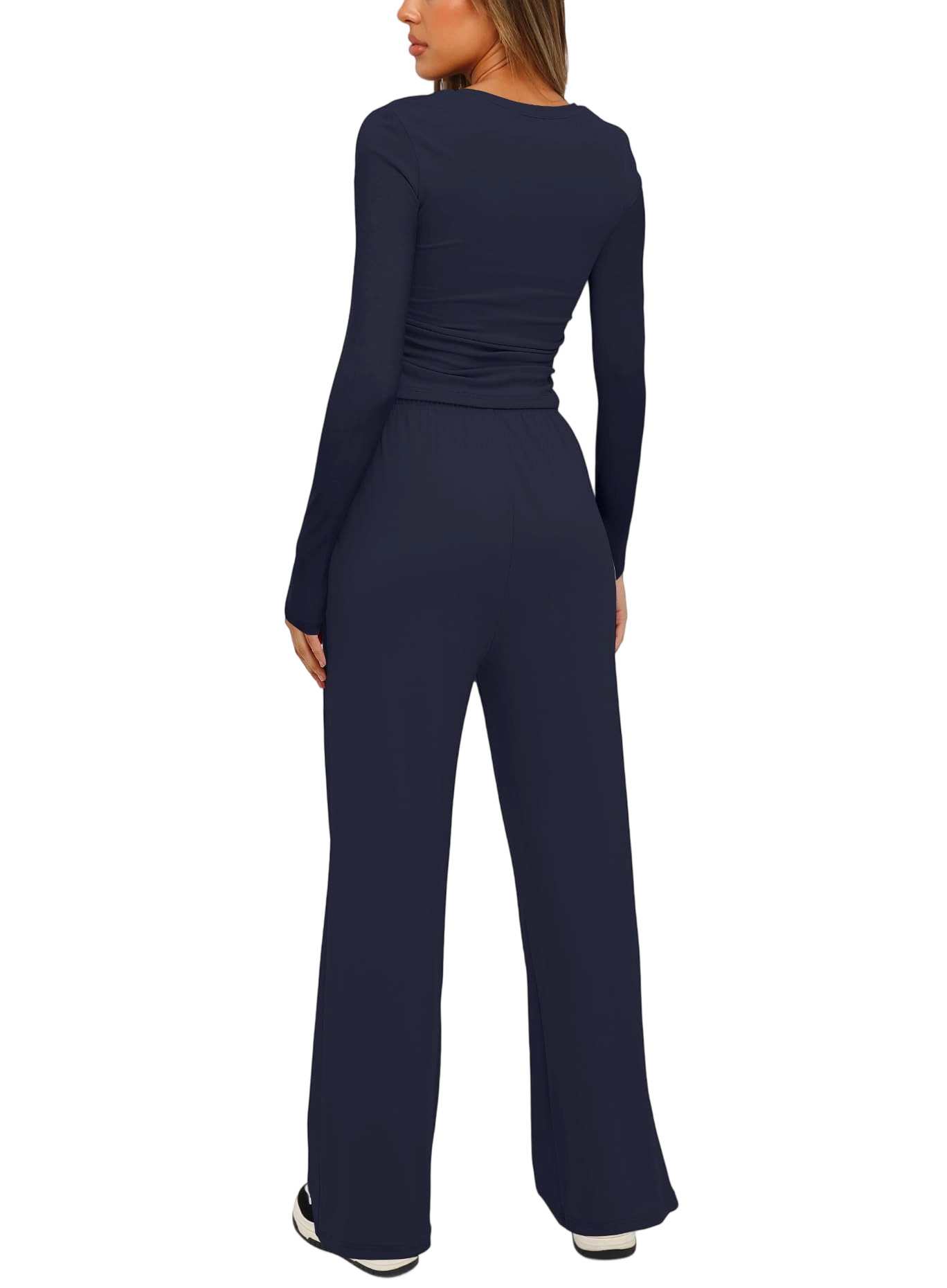 Stylish Design: Features high-waisted wide-leg pants and a casual long-sleeve top, combining fashion with comfort.