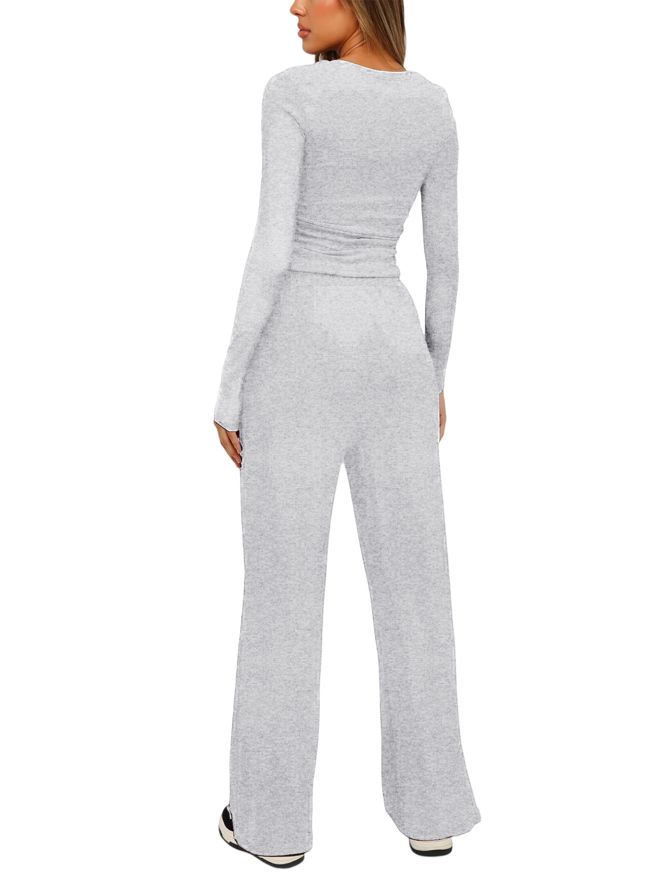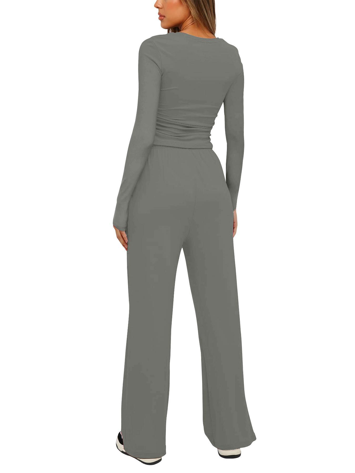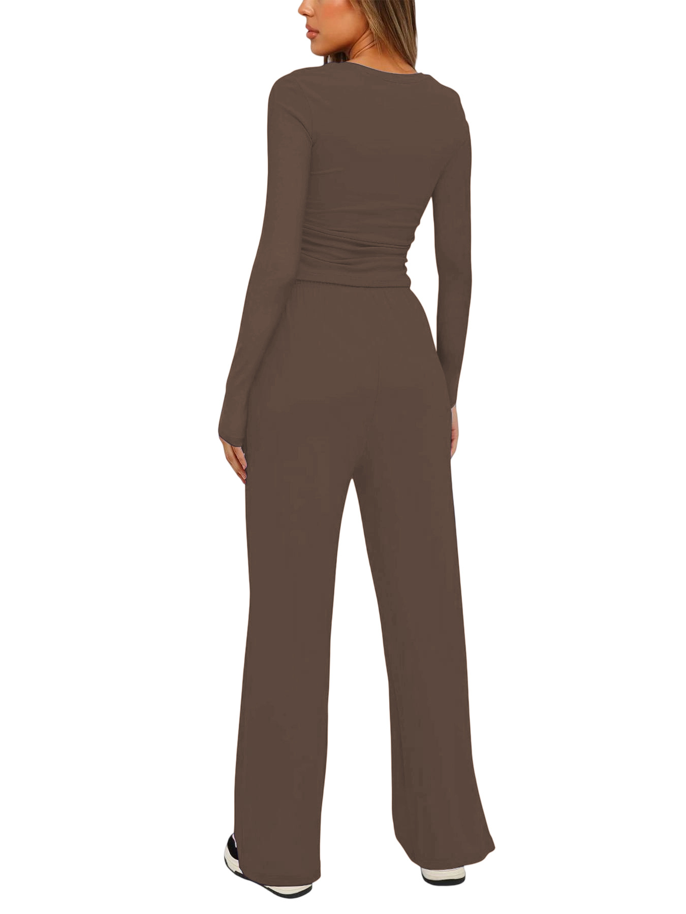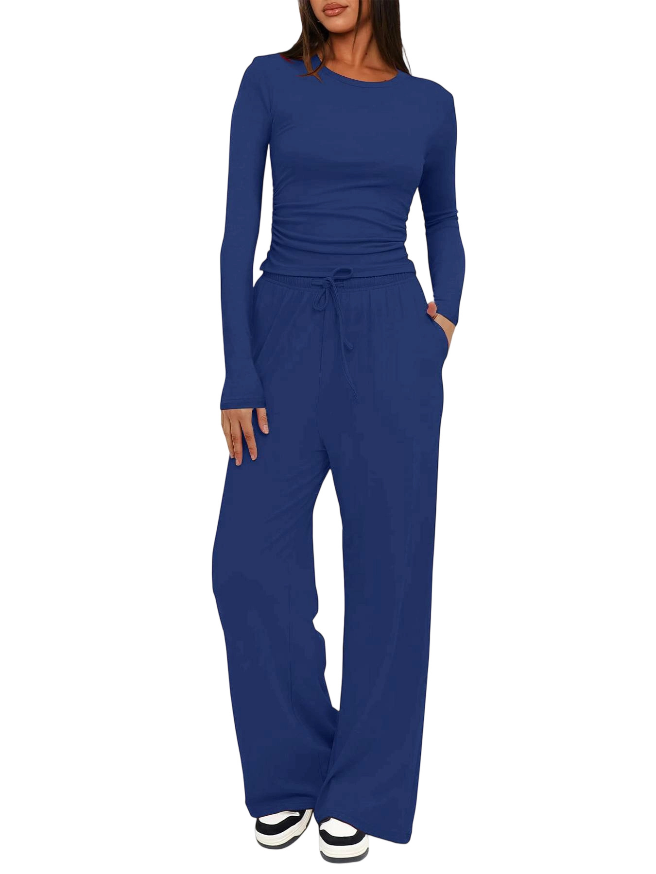 Stylish Design: Features high-waisted wide-leg pants and a casual long-sleeve top, combining fashion with comfort.