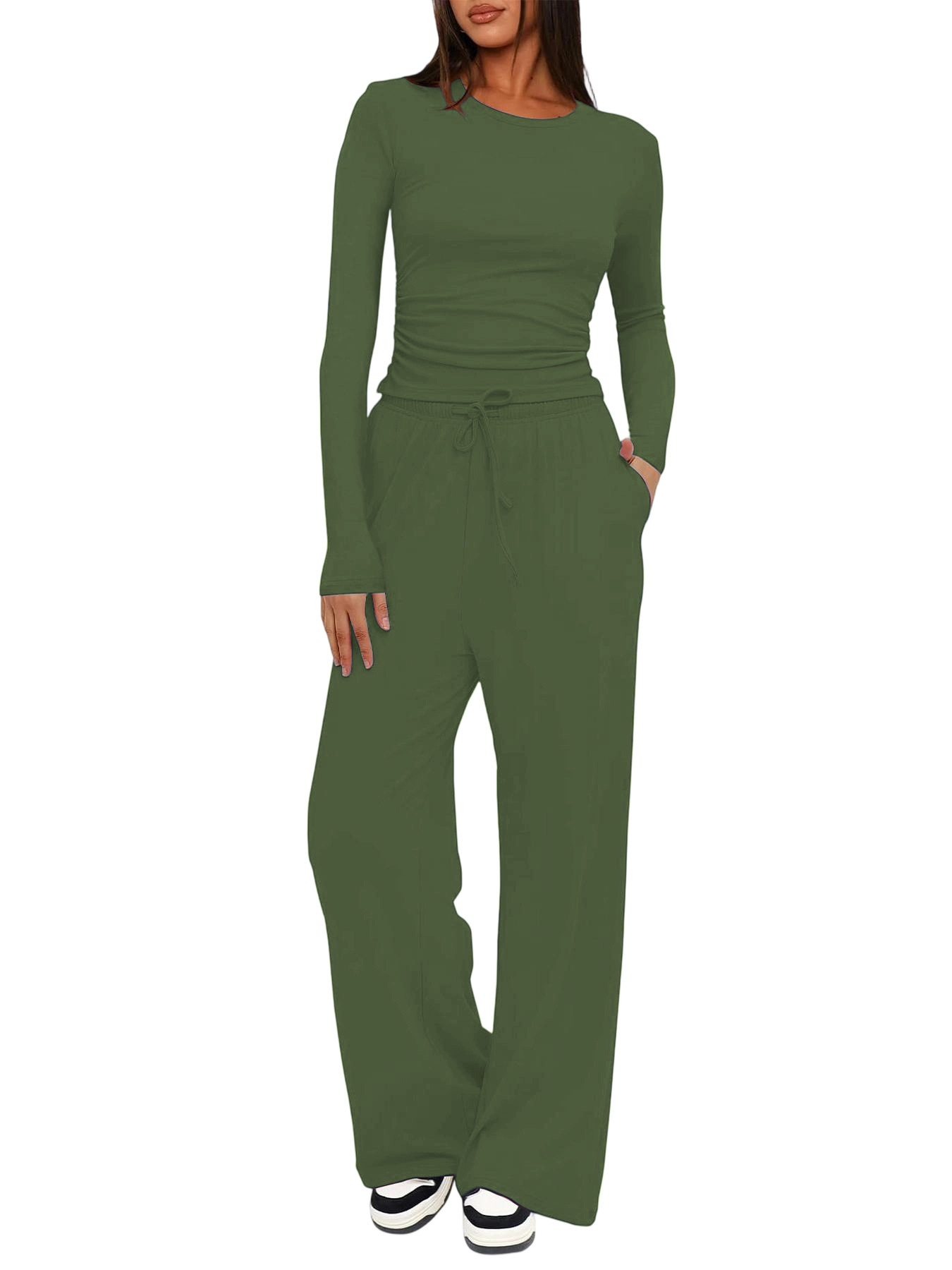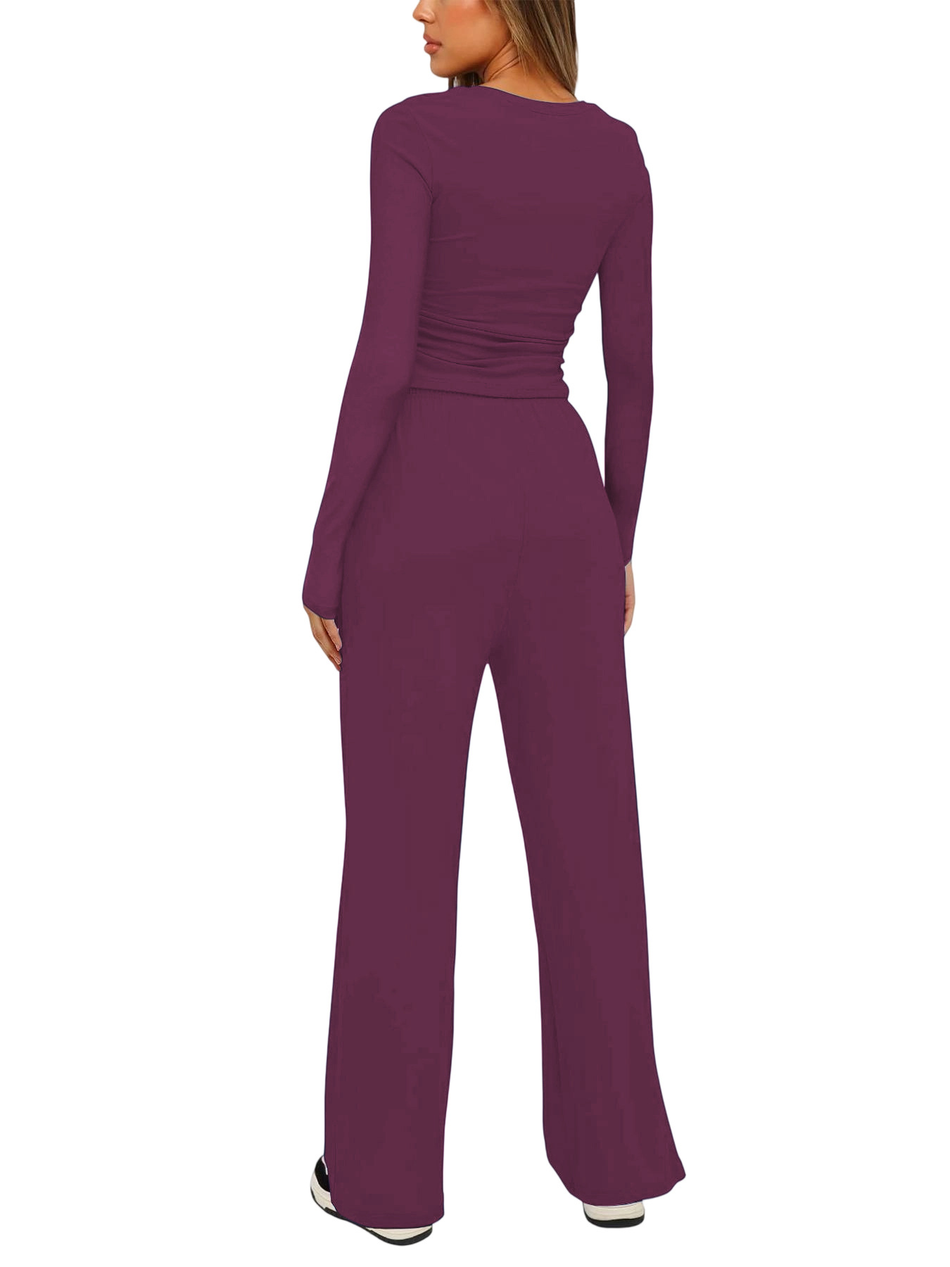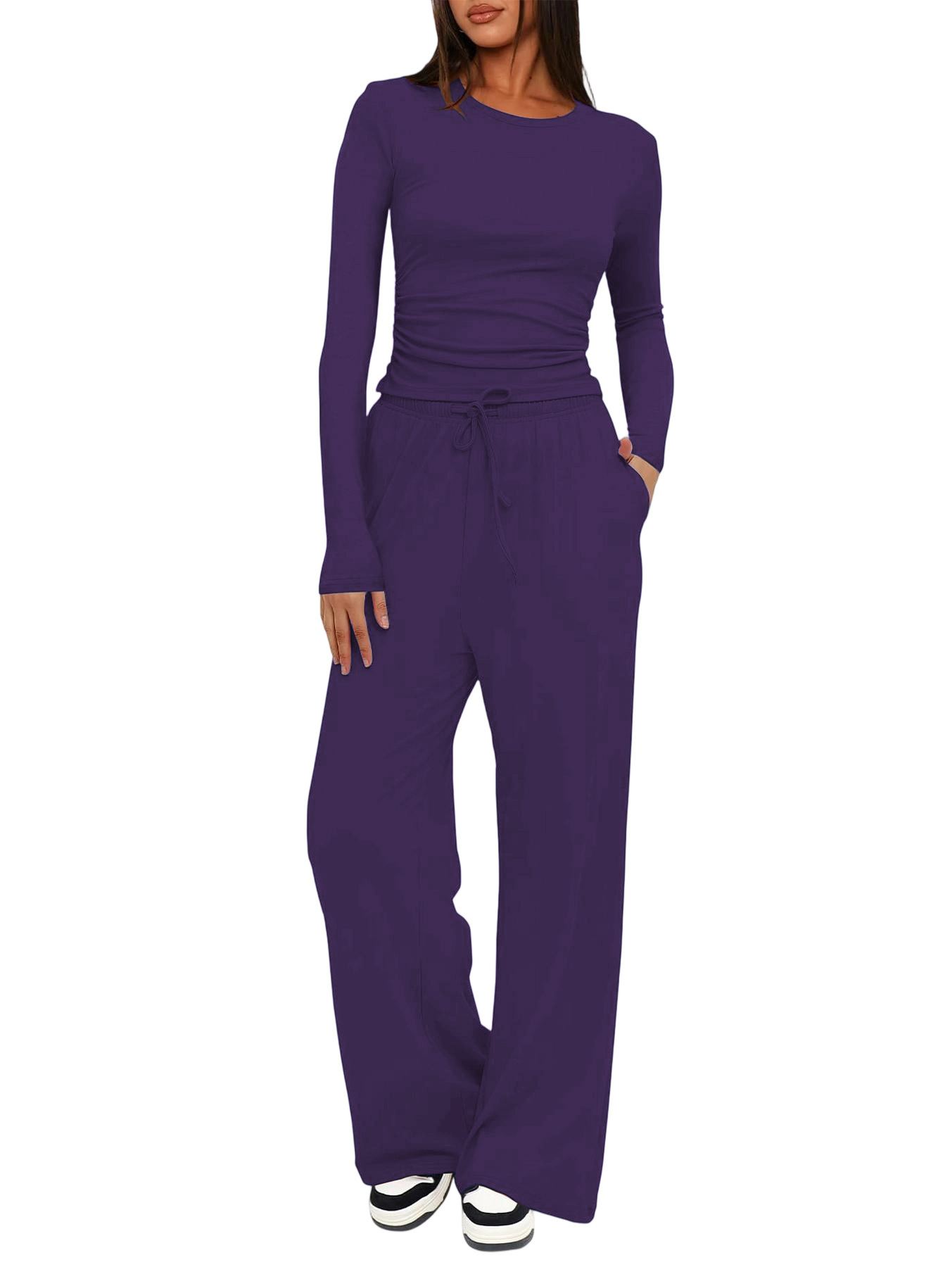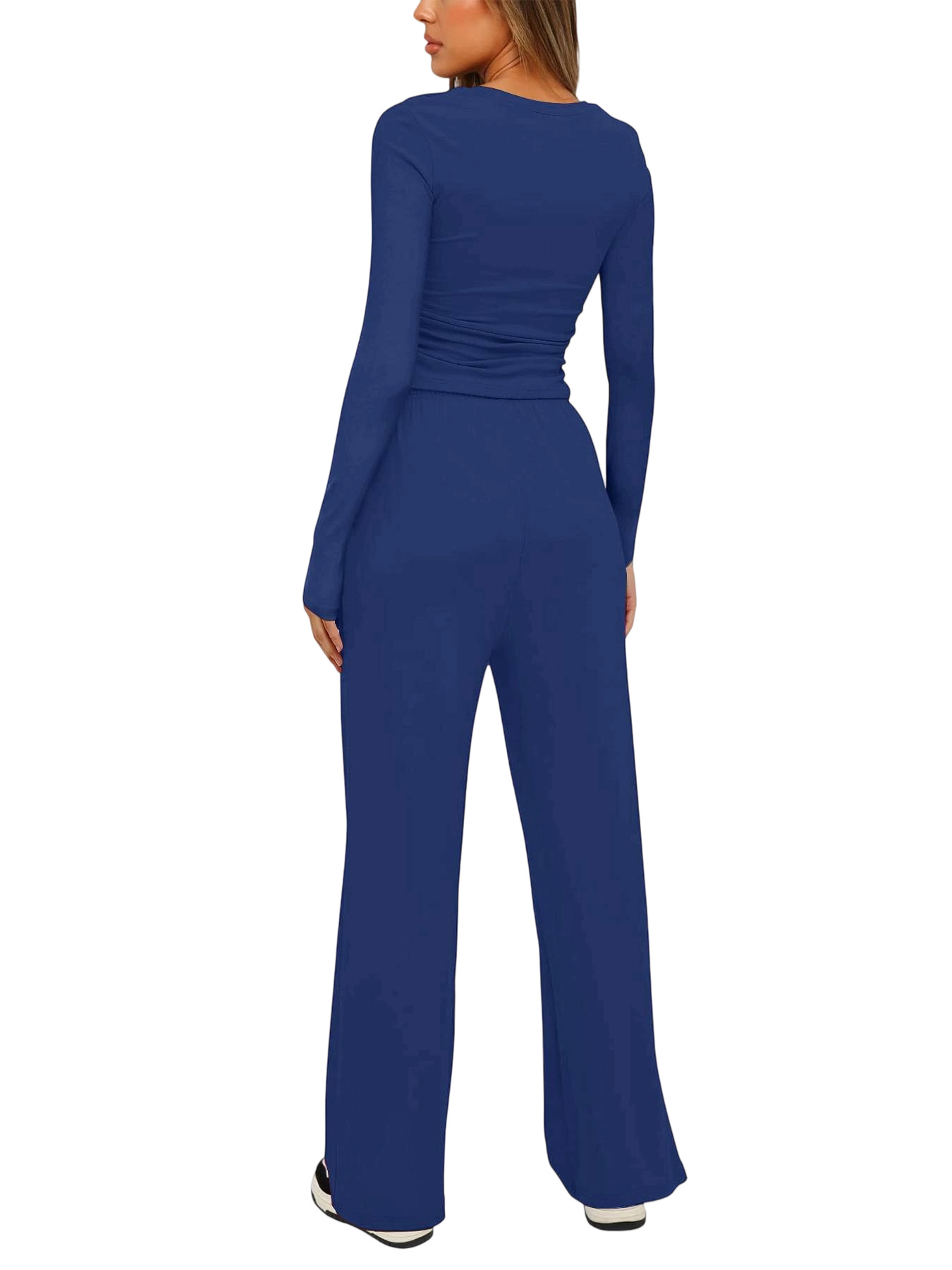 Stylish Design: Features high-waisted wide-leg pants and a casual long-sleeve top, combining fashion with comfort.