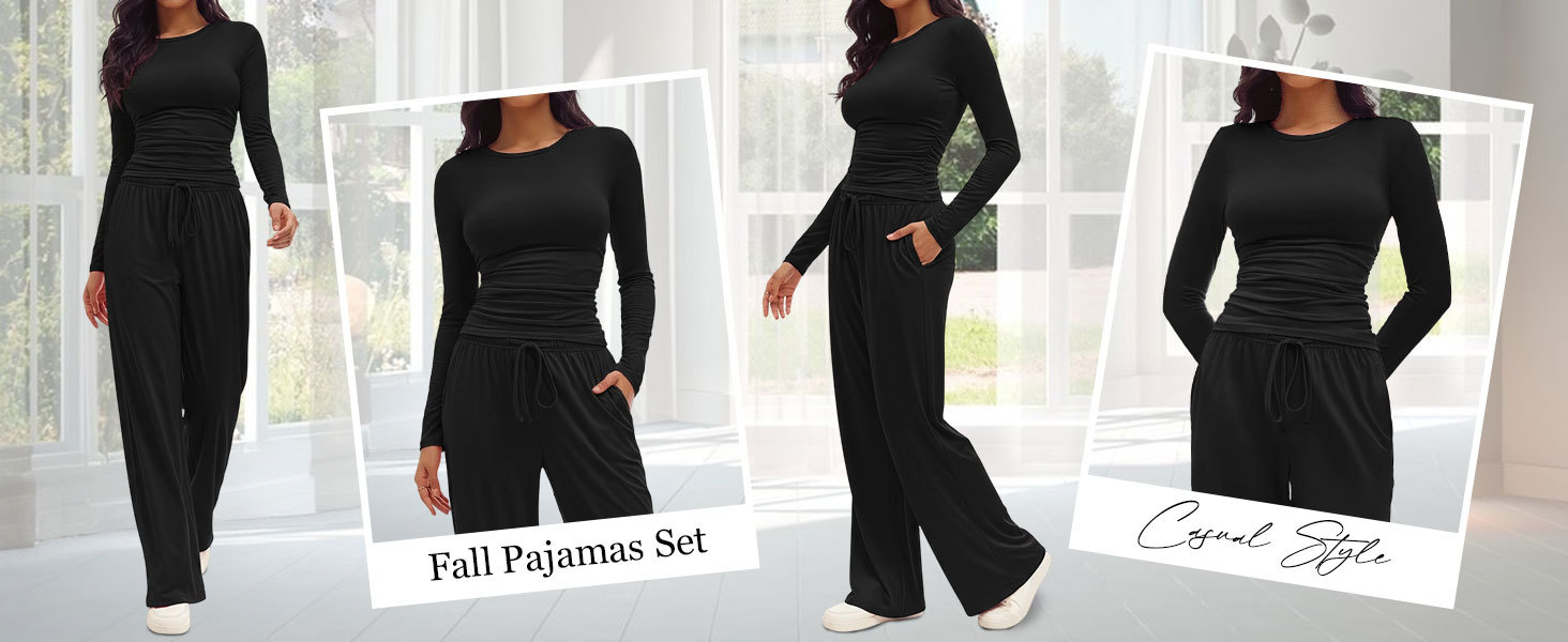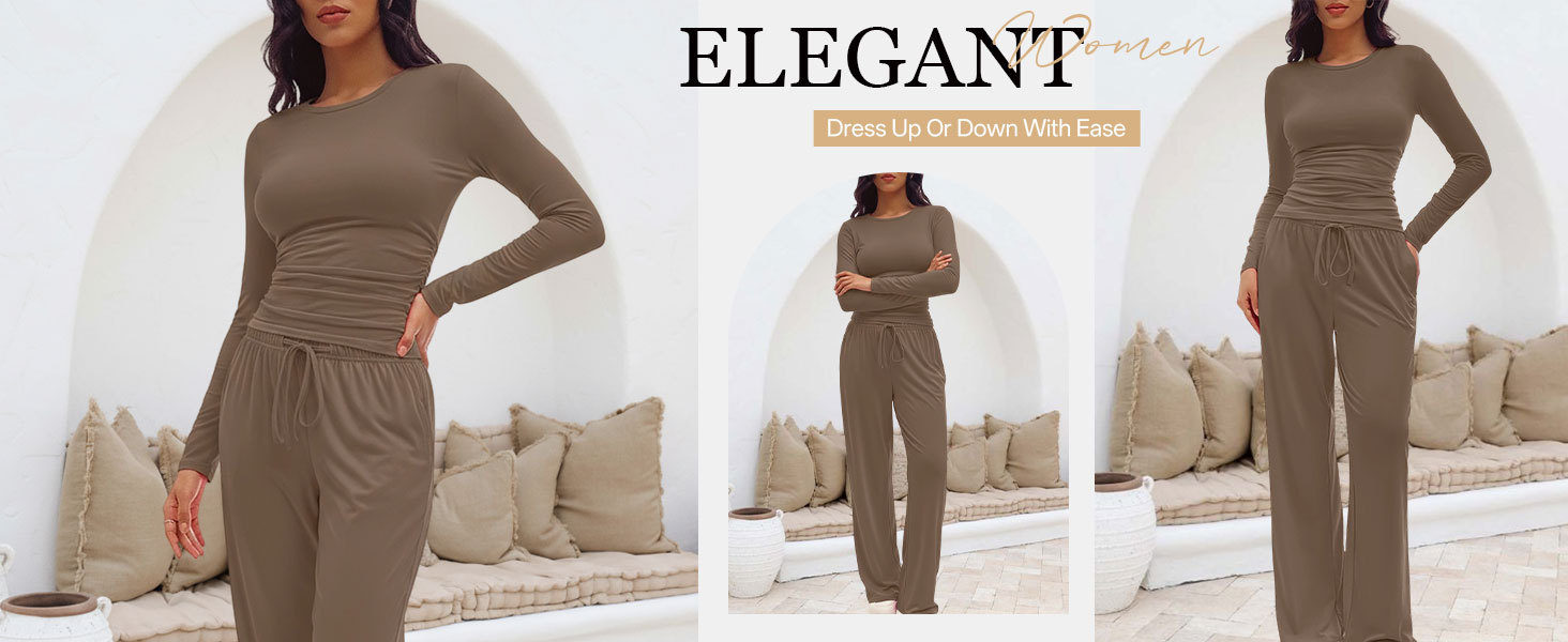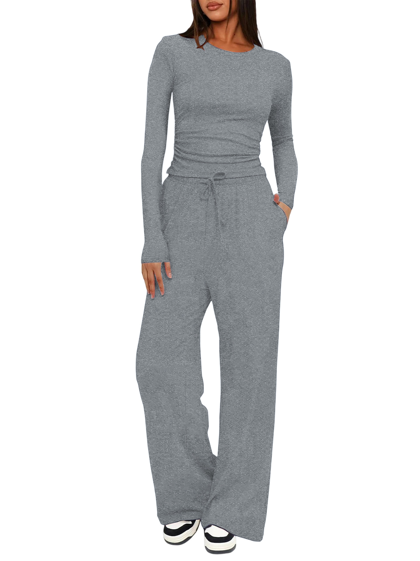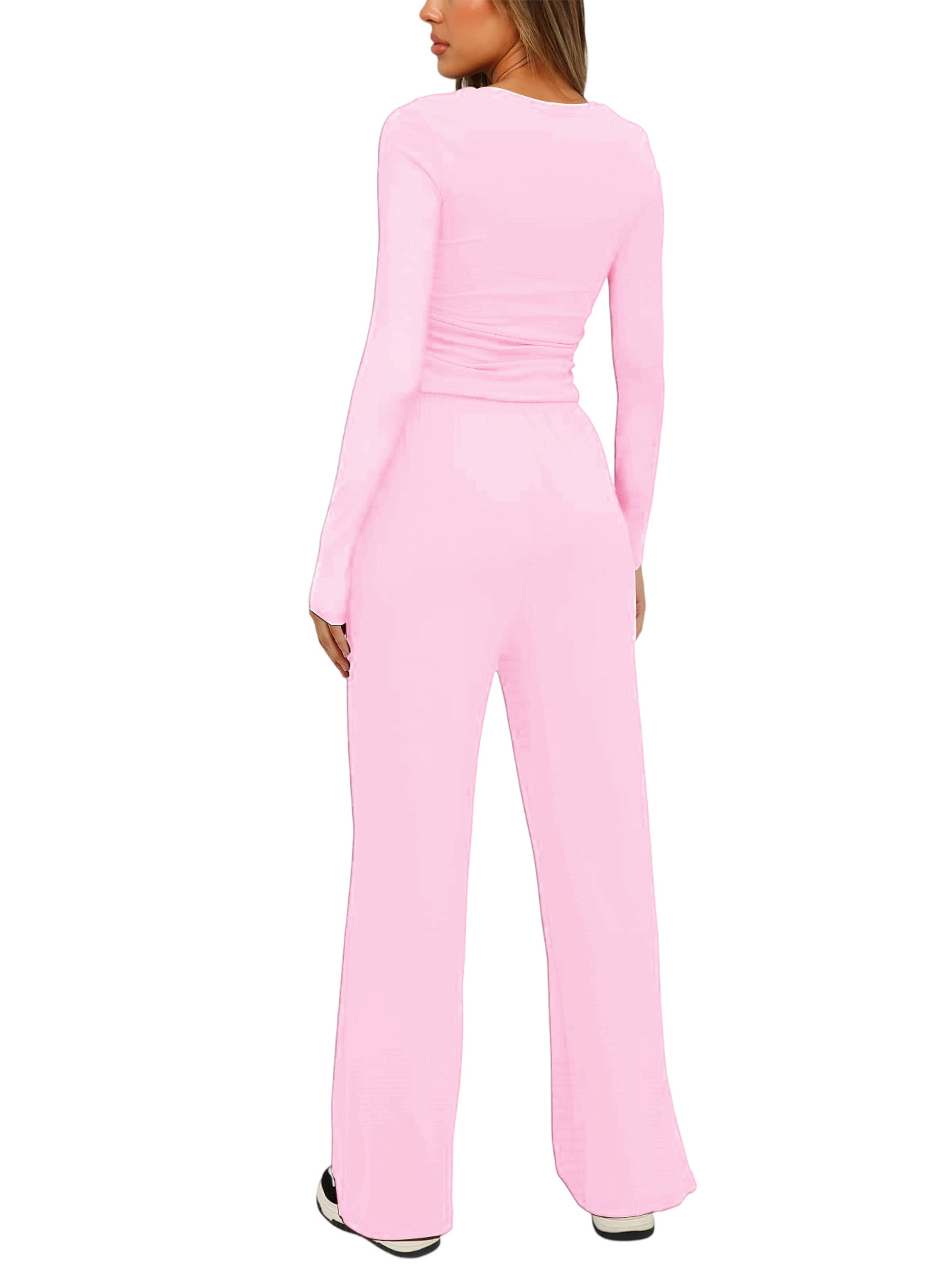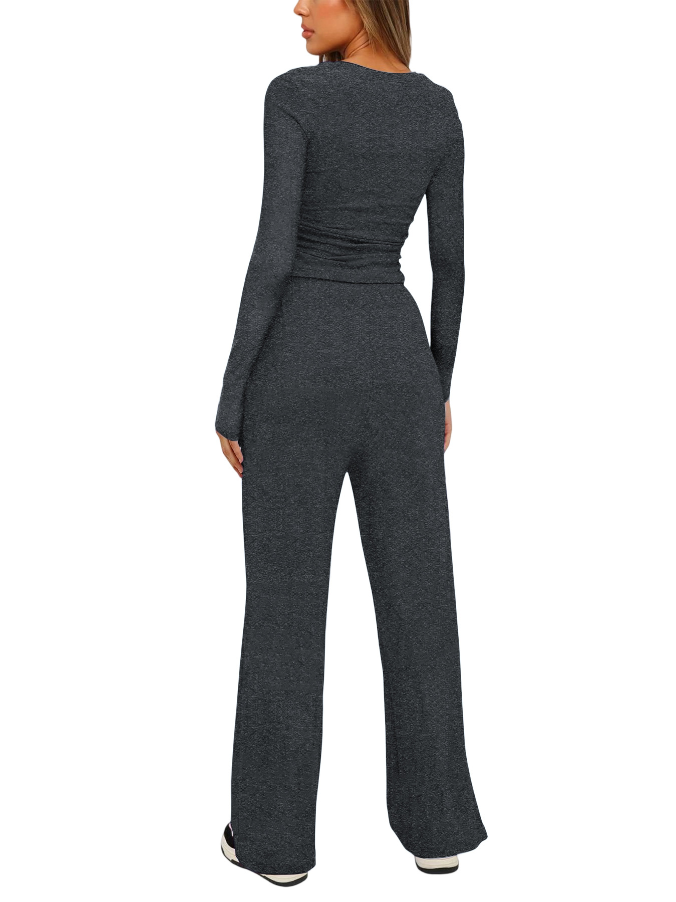 Stylish Design: Features high-waisted wide-leg pants and a casual long-sleeve top, combining fashion with comfort.