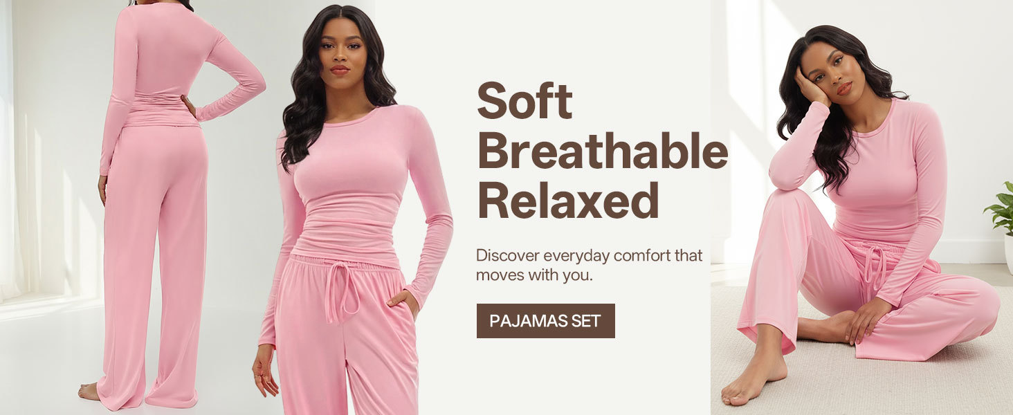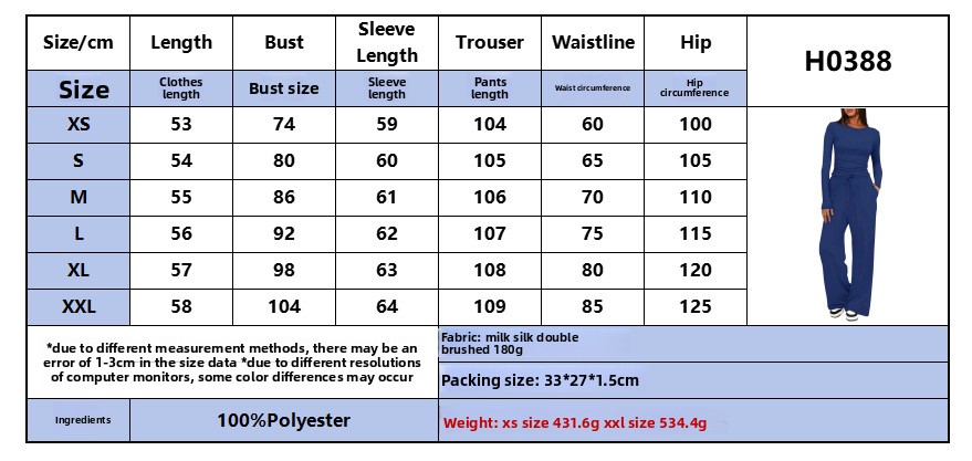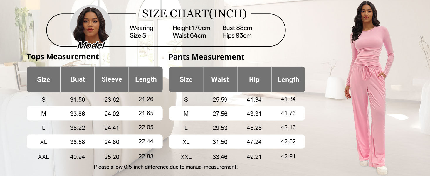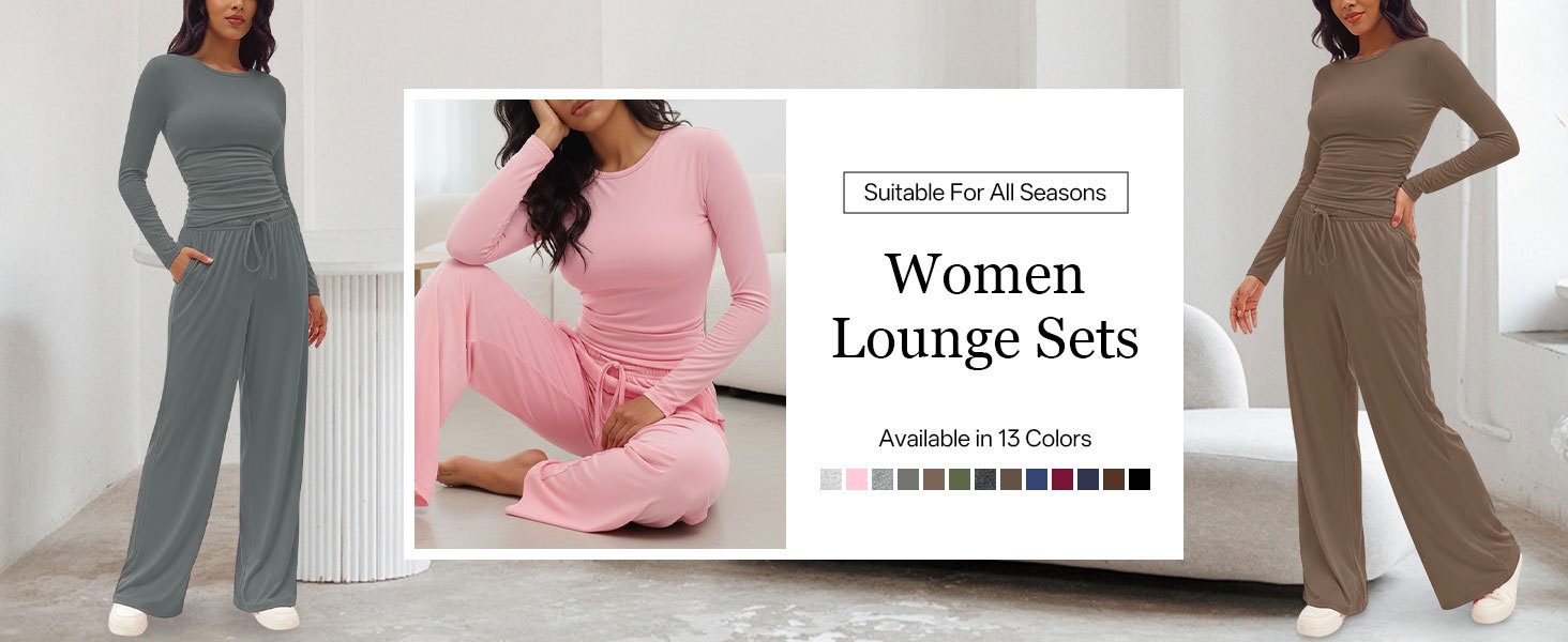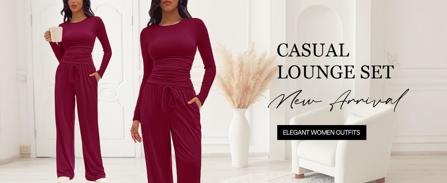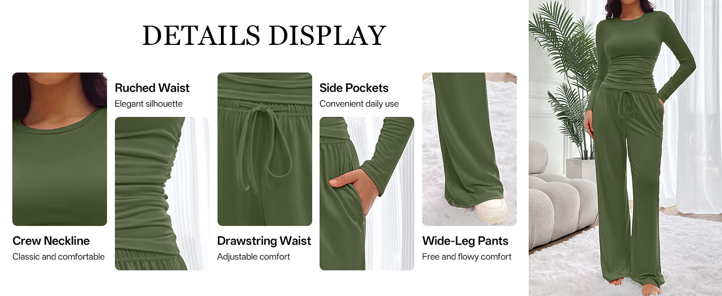 Stylish Design: Features high-waisted wide-leg pants and a casual long-sleeve top, combining fashion with comfort.