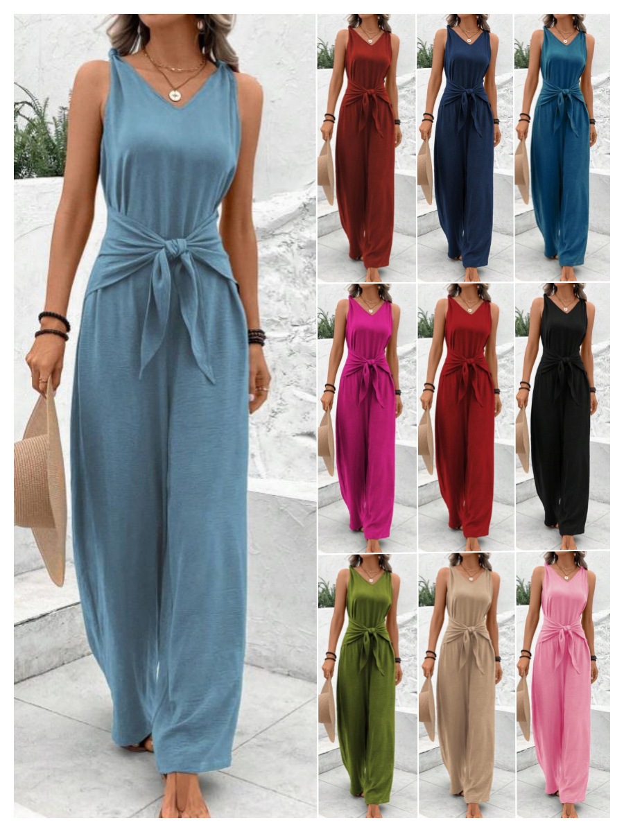 Estilo: Macacão com pernas largas, decote em V, sem mangas e cintura ajustável.